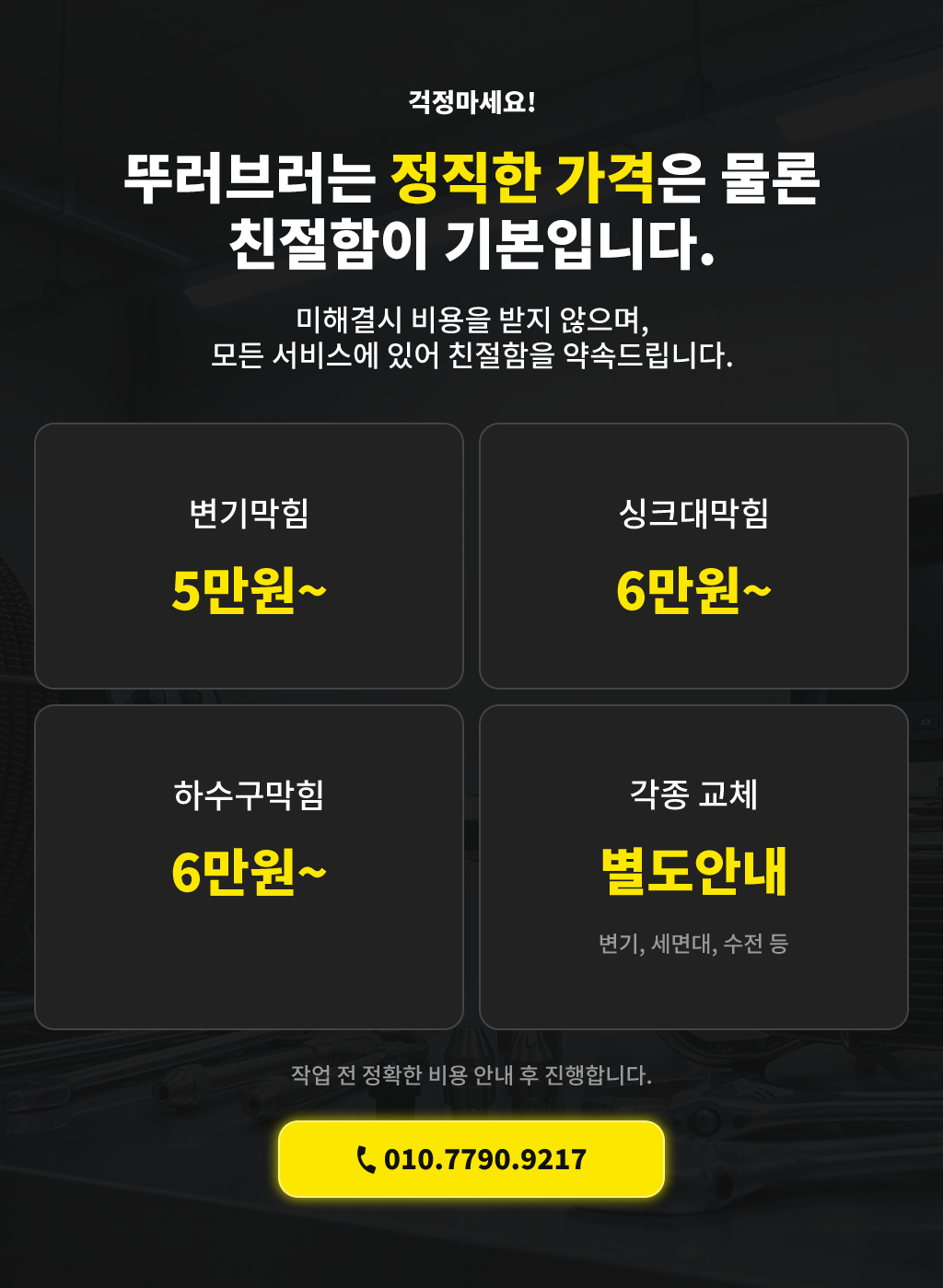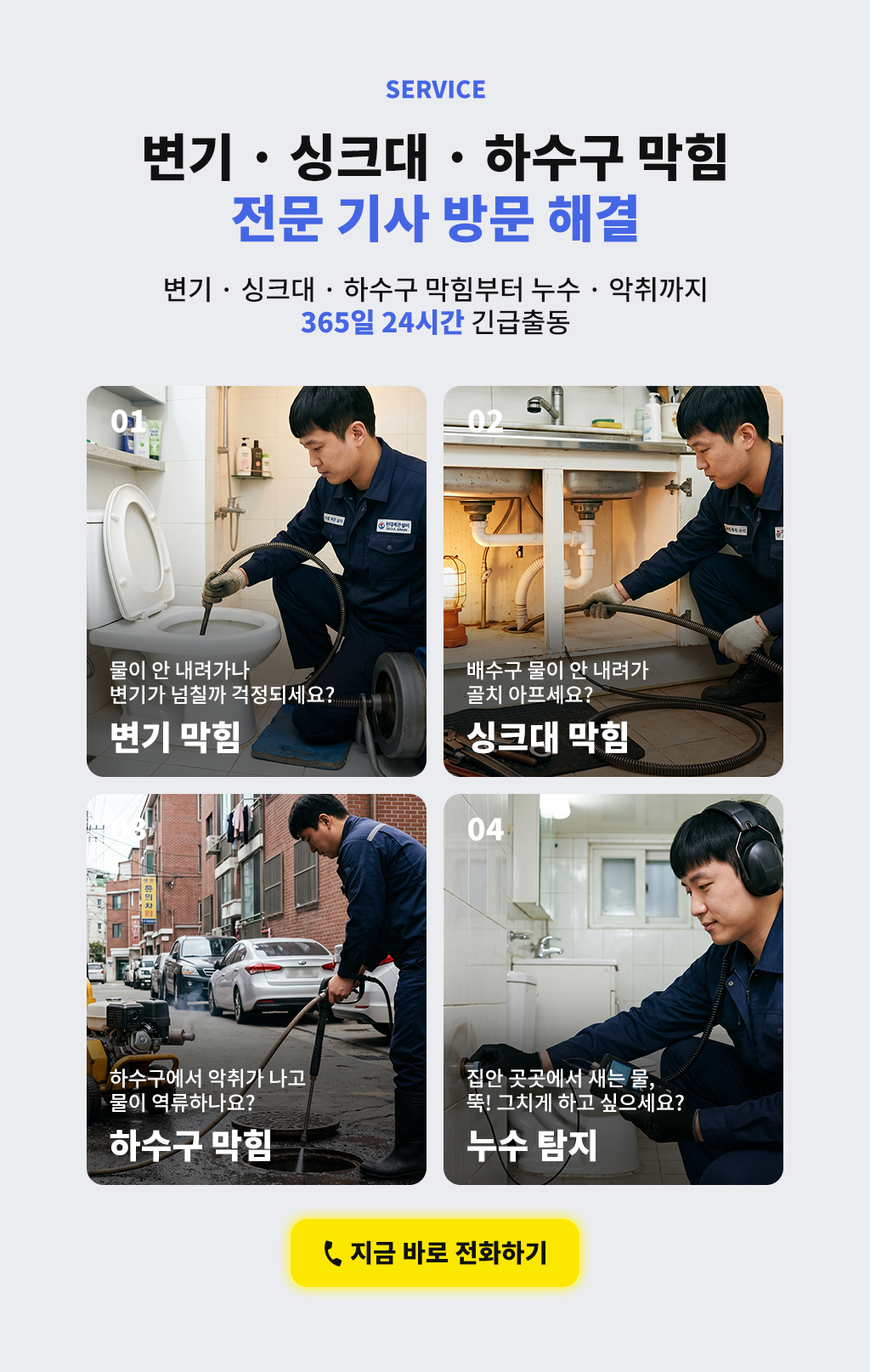변기, 싱크대, 하수구 막힘, 누수 탐지 전문 기사 방문 해결. 365일 24시간 긴급출동